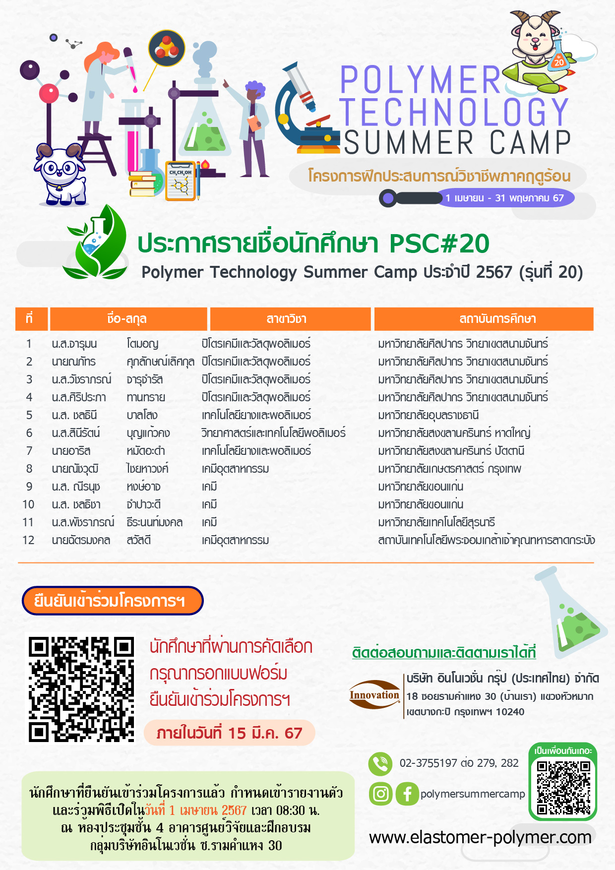 ประกาศรายชื่อนักศึกษาโครงการ Polymer Technology Summer Camp 2566 (รุ่นที่ 19)