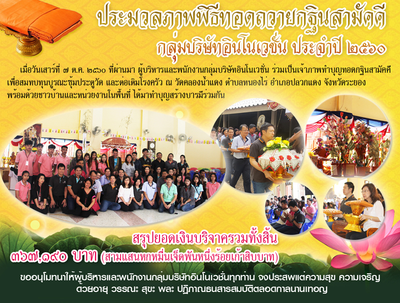 เมื่อวันเสาร์ที่ ๗ ต.ค. ๒๕๖๐ ที่ผ่านมา ผู้บริหารและพนักงานกลุ่มบริษัทอินโนเวชั่น ร่วมเป็นเจ้าภาพทำบุญทอดกฐินสามัคคี เพื่อสมทบทุนบูรณะซุ้มประตูวัด และต่อเติมโรงครัว ณ วัดคลองน้ำแดง ตำบลหนองไร่ อำเภอปลวกแดง จังหวัดระยอง พร้อมด้วยชาวบ้านและหน่วยงานในพื้นที่ ได้มาทำบุญสร้างบารมีร่วมกัน สรุปยอดเงินบริจาครวมทั้งสิ้น ๓๖๗,๑๙๐ บาท (สามแสนหกหมื่นเจ็ดพันหนึ่งร้อยเก้าสิบบาท) …