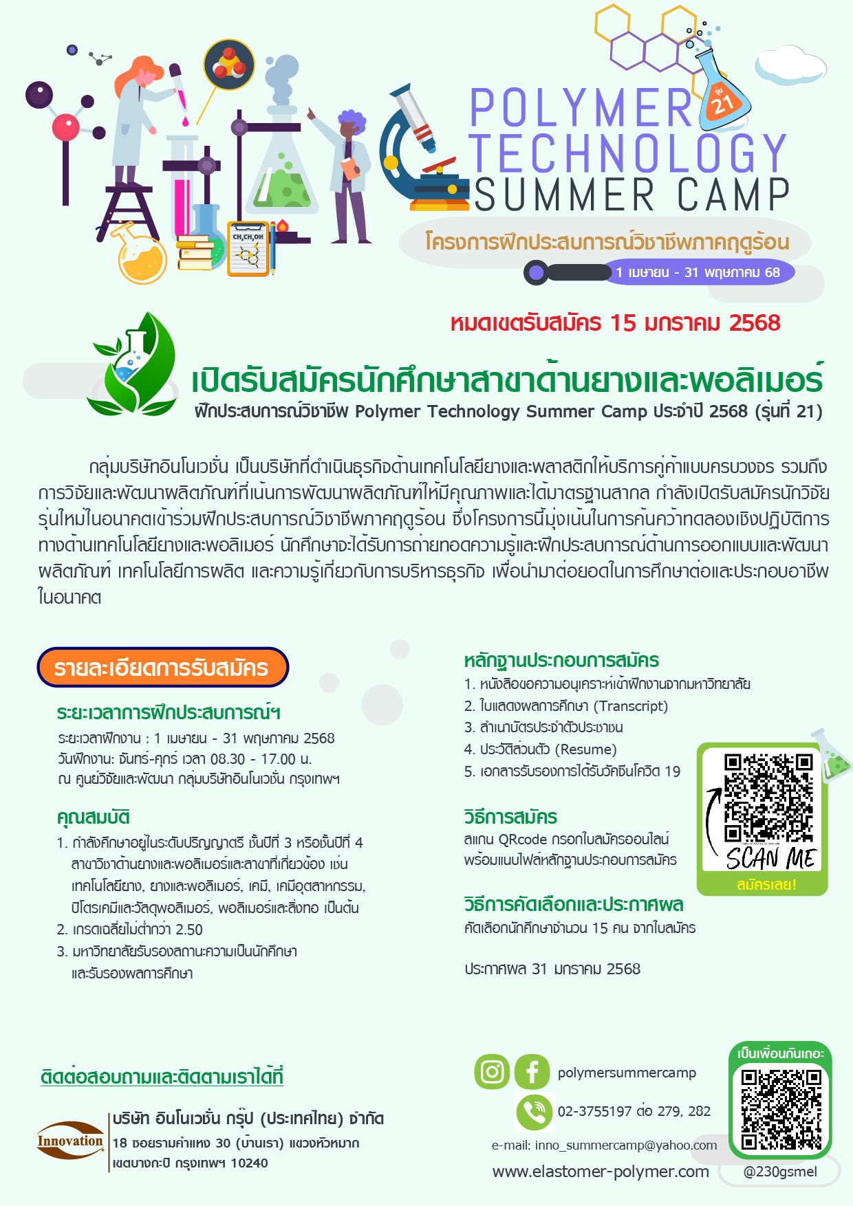 กลุ่มบริษัทอินโนเวชั่น เป็นบริษัทที่ดำเนินธุรกิจด้านเทคโนโลยียางและพลาสติกให้บริการคู่ค้าแบบครบวงจร รวมถึง การวิจัยและพัฒนาผลิตภัณฑ์ที่เน้นการพัฒนาผลิตภัณฑ์ให้มีคุณภาพและได้มาตรฐานสากล กำลังเปิดรับสมัครนักวิจัยรุ่นใหม่ในอนาคตเข้าร่วมฝึกประสบการณ์วิชาชีพภาคฤดูร้อน ซึ่งโครงการนี้มุ่งเน้นในการค้นคว้าทดลองเชิงปฏิบัติการทางด้านเทคโนโลยียางและพอลิเมอร์ นักศึกษาจะได้รับการถ่ายทอดความรู้และฝึกประสบการณ์ด้านการออกแบบและพัฒนาผลิตภัณฑ์ เทคโนโลยีการผลิต และความรู้เกี่ยวกับการบริหารธุรกิจ เพื่อนำมาต่อยอดในการศึกษาต่อและประกอบอาชีพในอนาคต