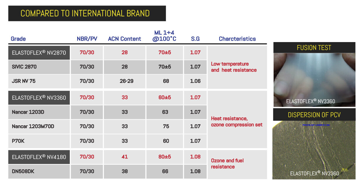 Elastoflex® NV3360 is a mechanically fully-fluxed blend of 70 parts acrylonitrile-butadiene rubber (NBR) with 34% acrylonitrile (CAN) content and 30 parts polyvinyl chloride (PVC). The blend has not only good weather as well as ozone resistance but also good oil, fuel. Heat and good compression set.